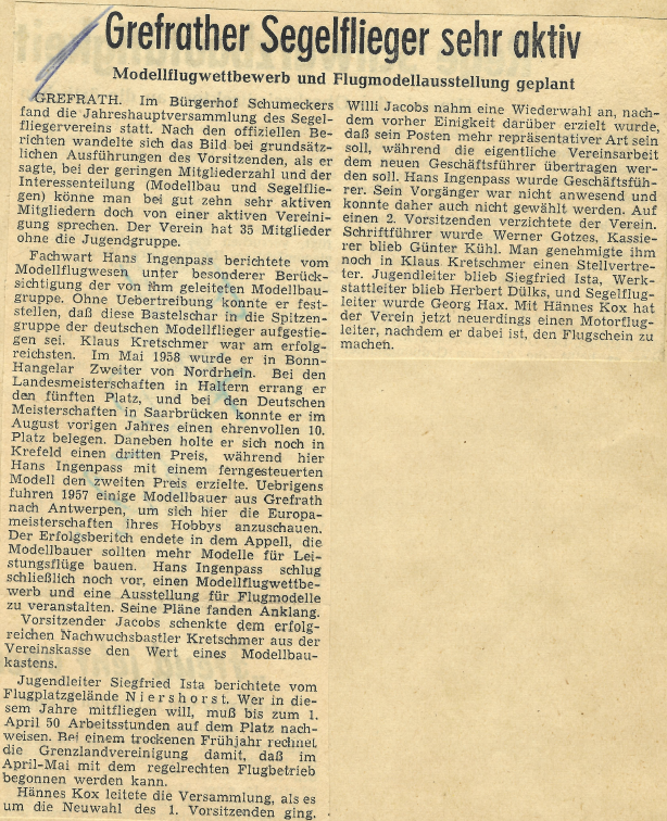 Artikel vom 3.11.1956 – Rheinische Post Grefrather Luftsportverein wieder gegründet — Alte Tradition als Ansporn GREFRATH. Auf der Gründungsversammlung des Luftsportvereins im Bürgerhof Schumeckers am Mittwochabend bezeichnete der Versammlungsleiter, Lehrer Georg Pauls, die Gründung als eine Wiedergeburt des Vereins, der sich vor dem Kriege in Grefrath mit dem Luftsport befaßte.…